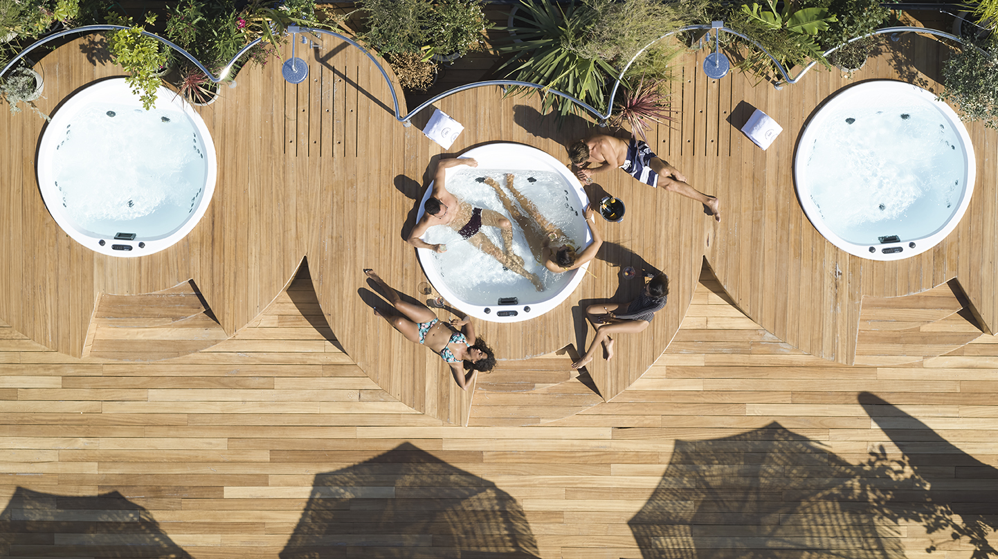 - Geräumige Dachterrasse mit tollem Ausblick und Entspannungsbereich mit Liegestühlen, Hängematten und vier Outdoor-Whirlpools